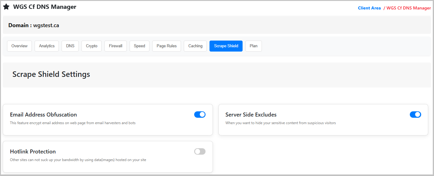 Protect website content and sensitive data using Cloudflare Scrape Shield tools including email obfuscation, server-side excludes, and hotlink protection directly from WISECP.