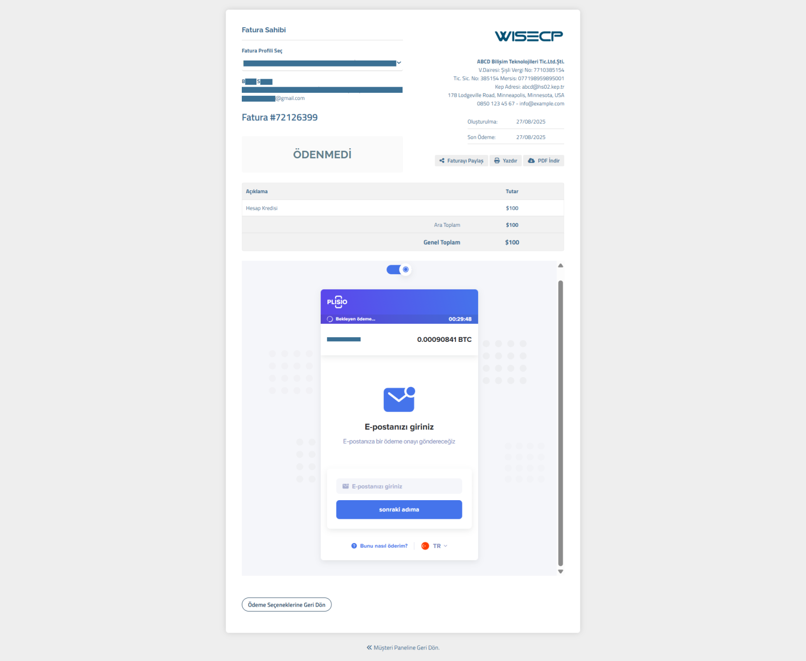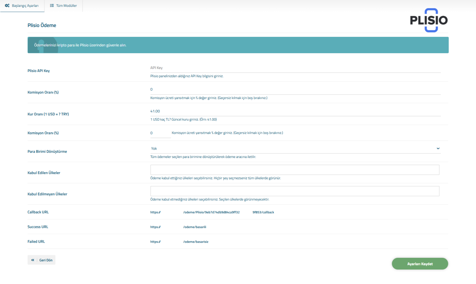 Plisio üyeliğiniz üzerinde sadece Custom API oluşturduktan sonra API KEY 'inizi modüle girerek mağazanızı WISECP üzerinde aktif edebilir, dilediğiniz tutarlarda coin ödemesi almaya başlayabilirsiniz.